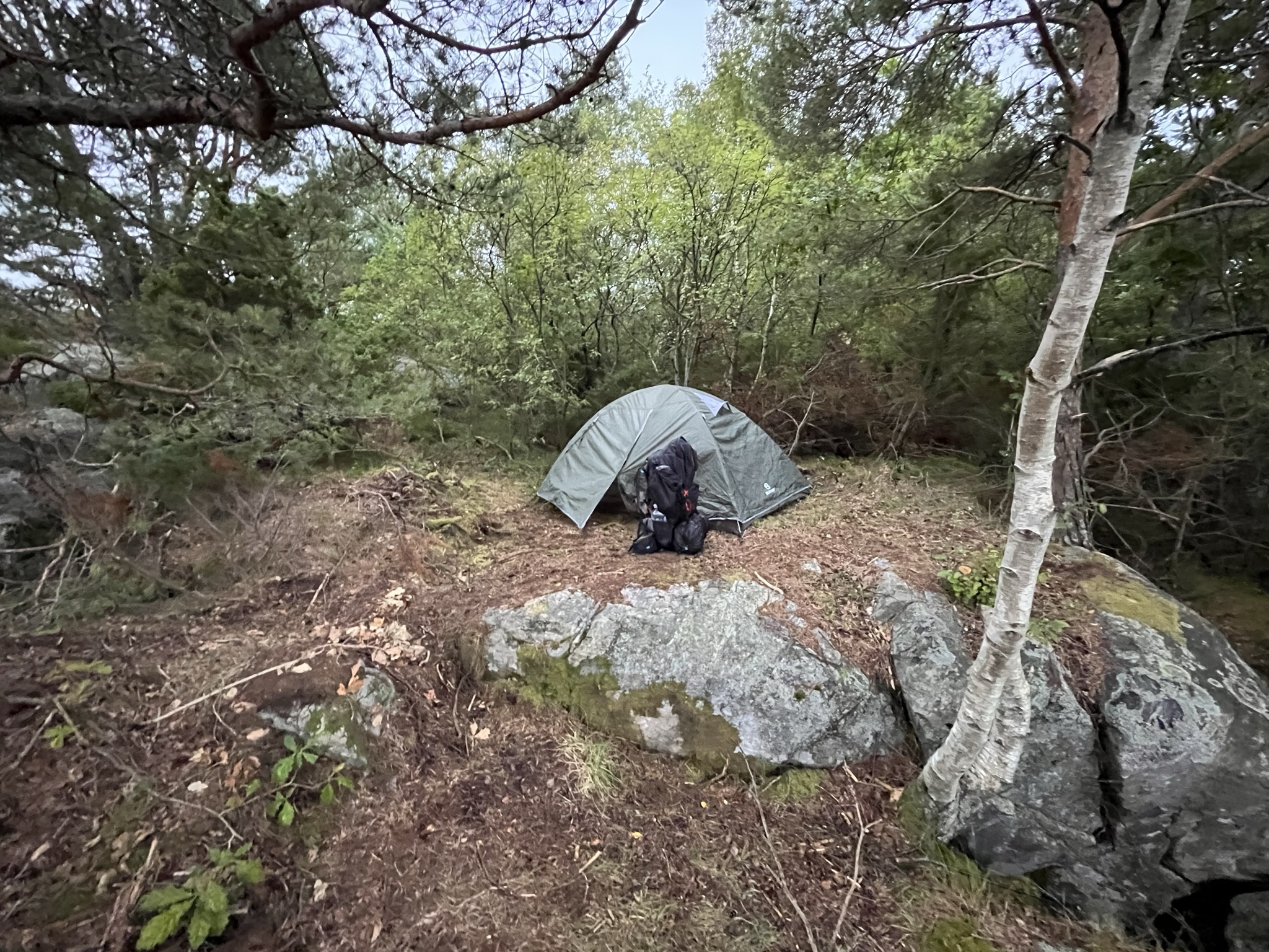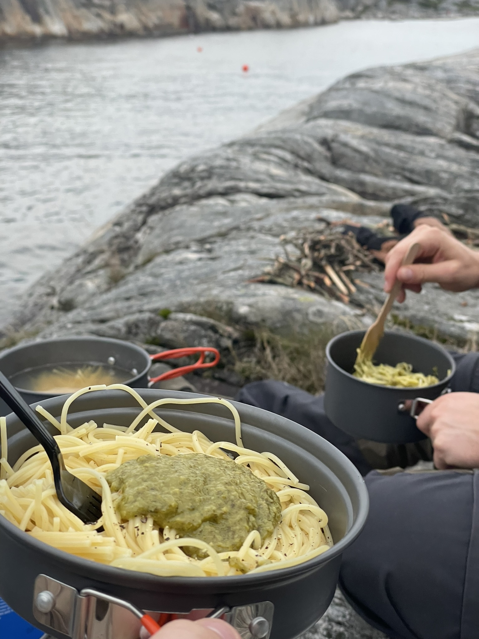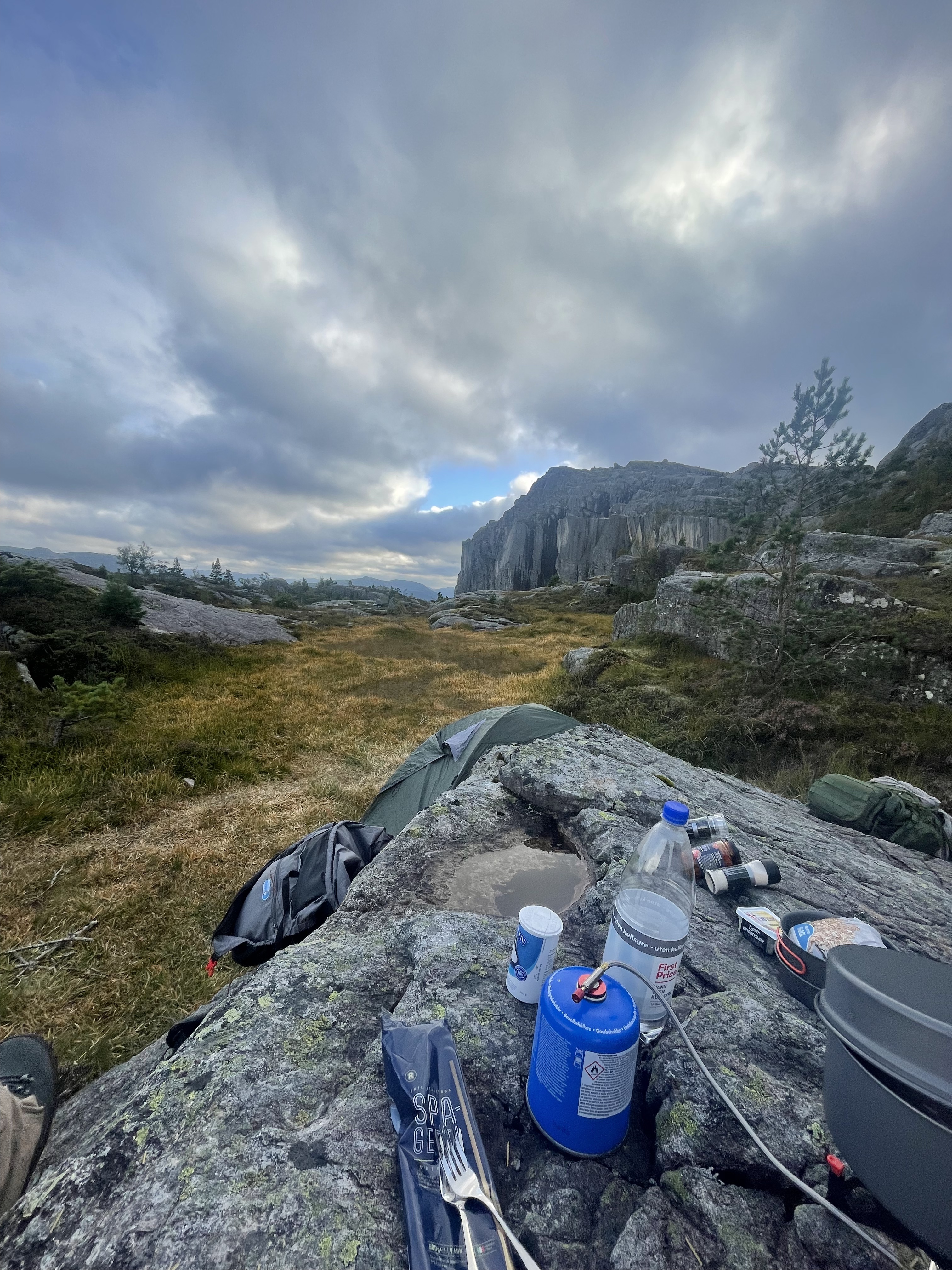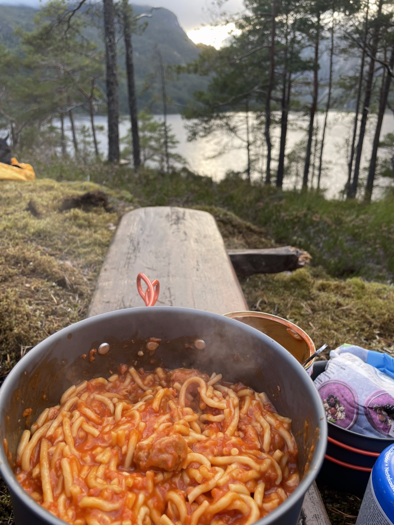Socks? Wet. Did I have a second pair with me? No. Why, you ask? Lighter backpack after the hike yesterday. Essentials should be on us everytime? Yes absolutely. Learned. Food? Oh were we hungry. Our meal? Tomatosoup with a whole pack of crispbread and canned spaghetti with little sausages as well as meatballs. Not that of a fine dining experience, nonetheless it was all we needed.