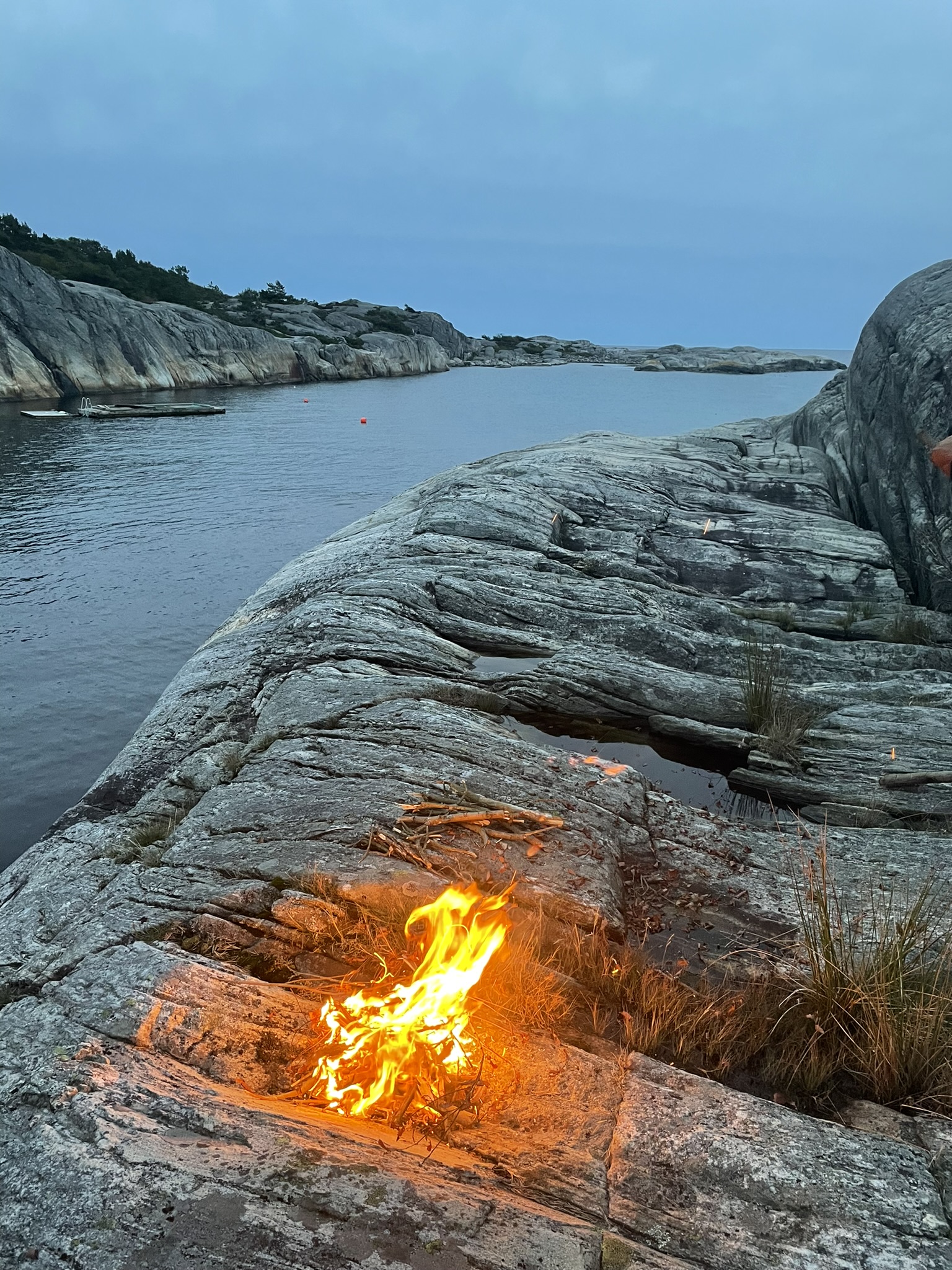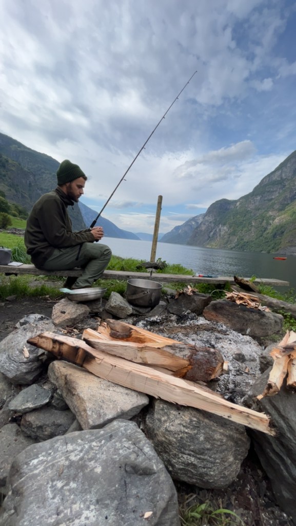 With this whole new energy, we finally wanted to start fishing. First throw, wobblers gone. Bye bye have a good life. Second throw, wobbler stuck in seaweed. Third throw? Wasn’t happening until the second wobbler was brought back. So we hopped into the water to, first swim in the fjord (milestone check) and second retrieve the wobbler, but without success. While trying to stretch the string to see where it was stuck, it broke and the wobbler was gone. That’s it for today – so we made fire.
