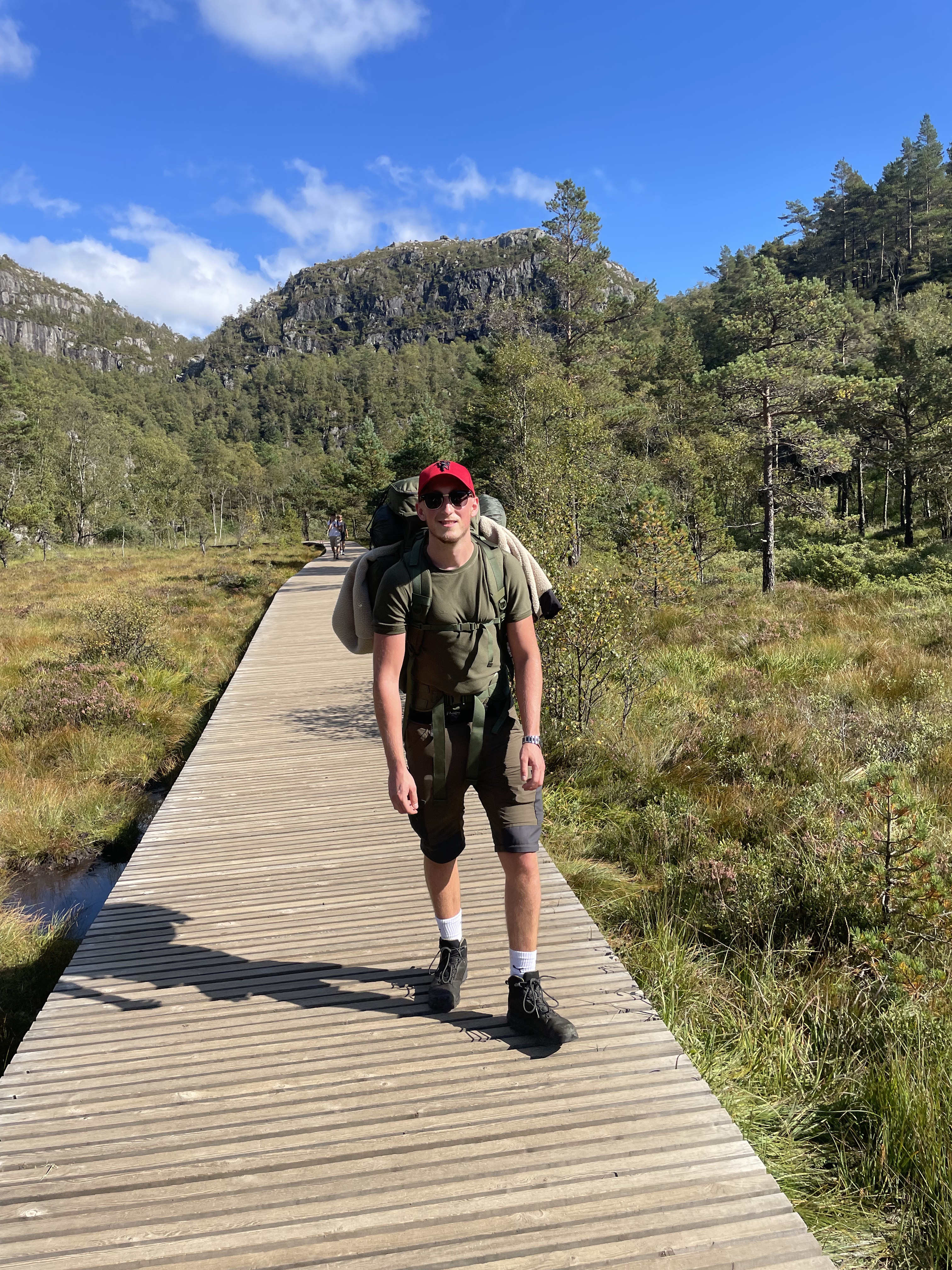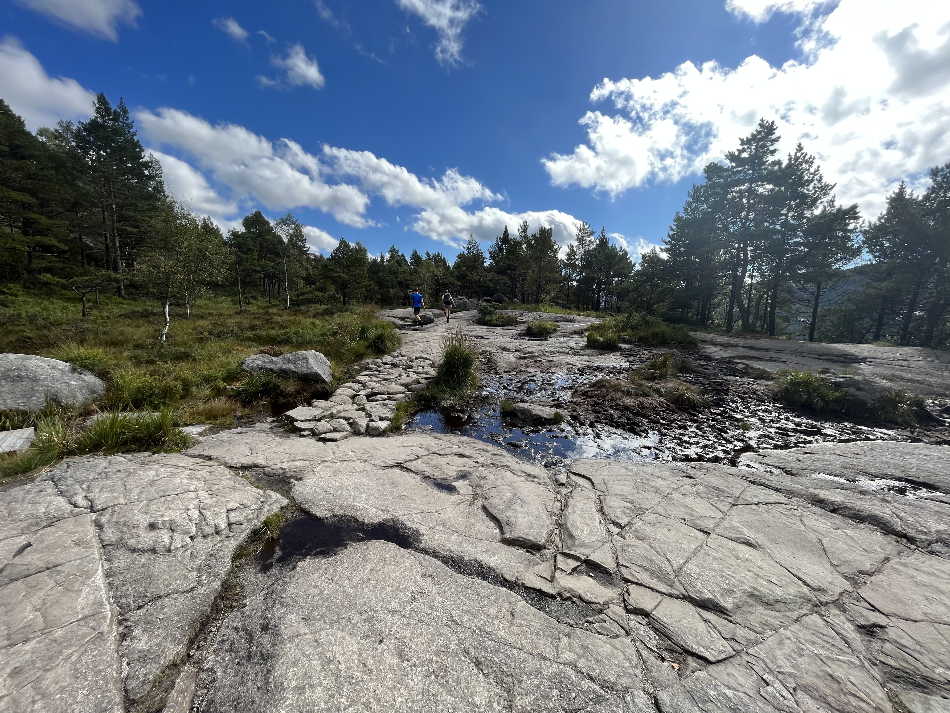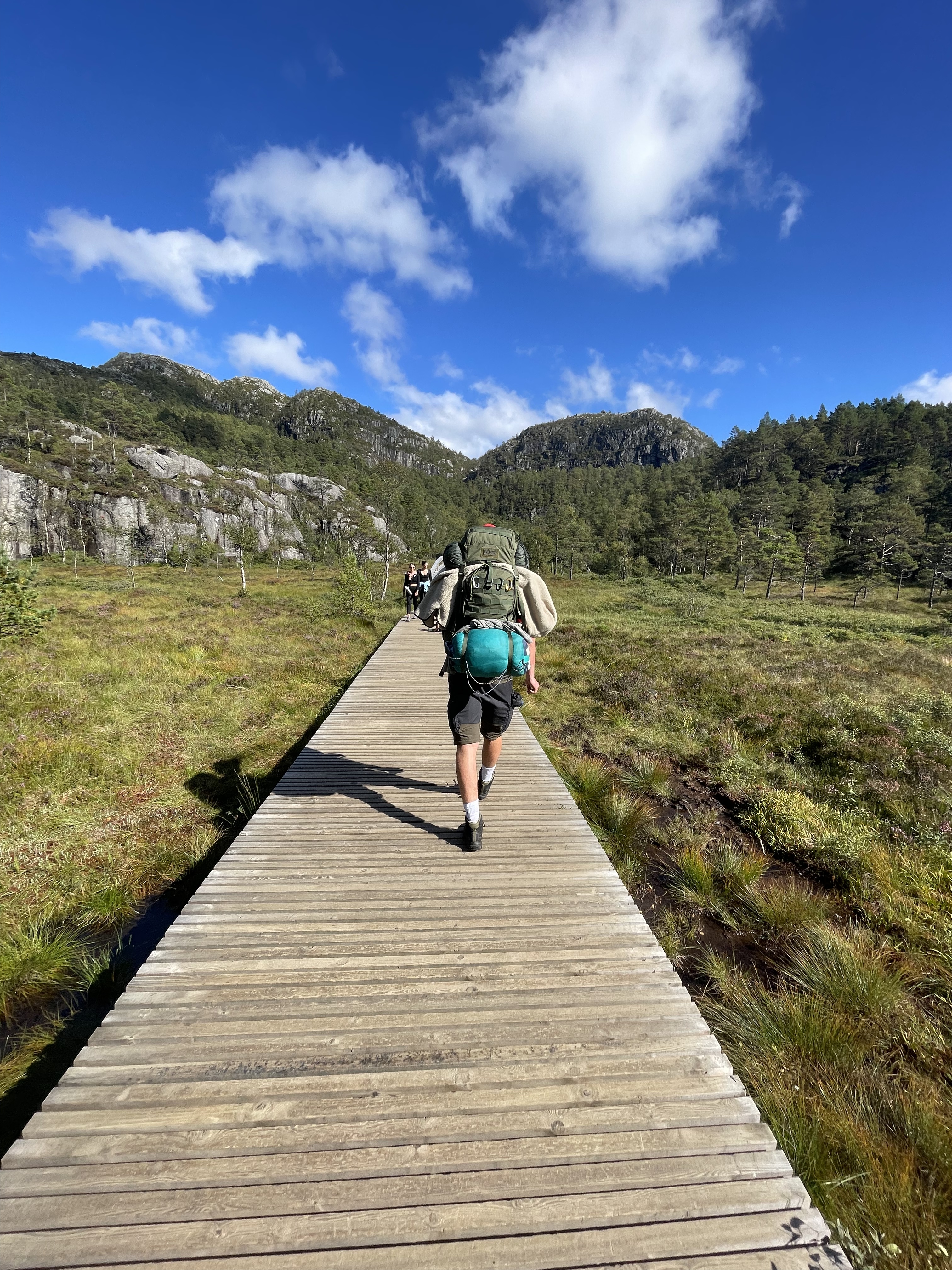 500 meters after the start, Seife noticed he forgot the drone. A short wait and we went along. The opening part was next to the street until finally back in the woods. Around 300 000 visit Preikestolen every year. It was pretty obvious. The path was a maximum of 5% unchanged, big stones, small stones, even rocks were put there. Hiking boots, pants, merino shirts and big backpacks. That’s how we lucked. Next to us sneacker, jeans and branded shirts. Alright, it’s a difference if you want to camp there or just visit.