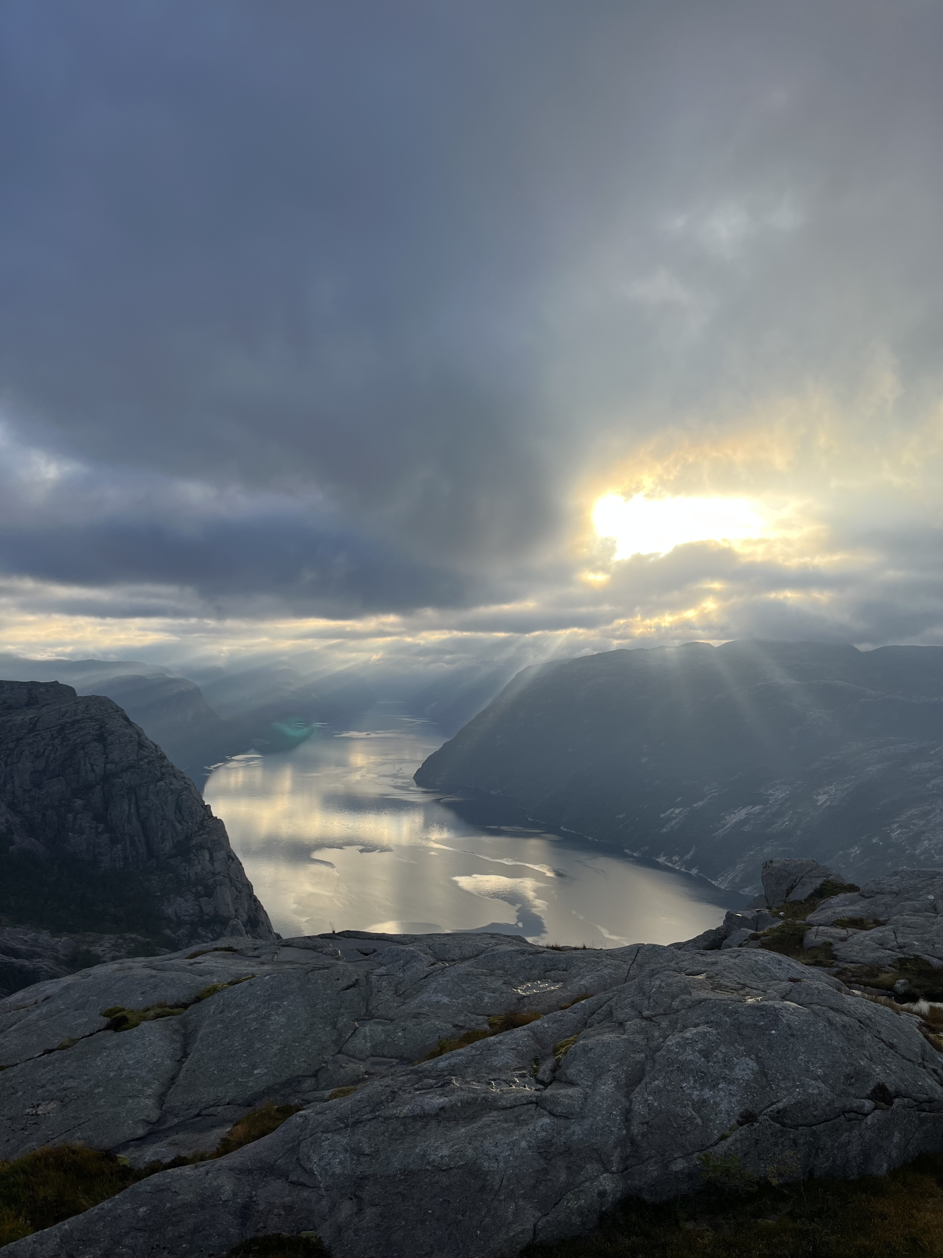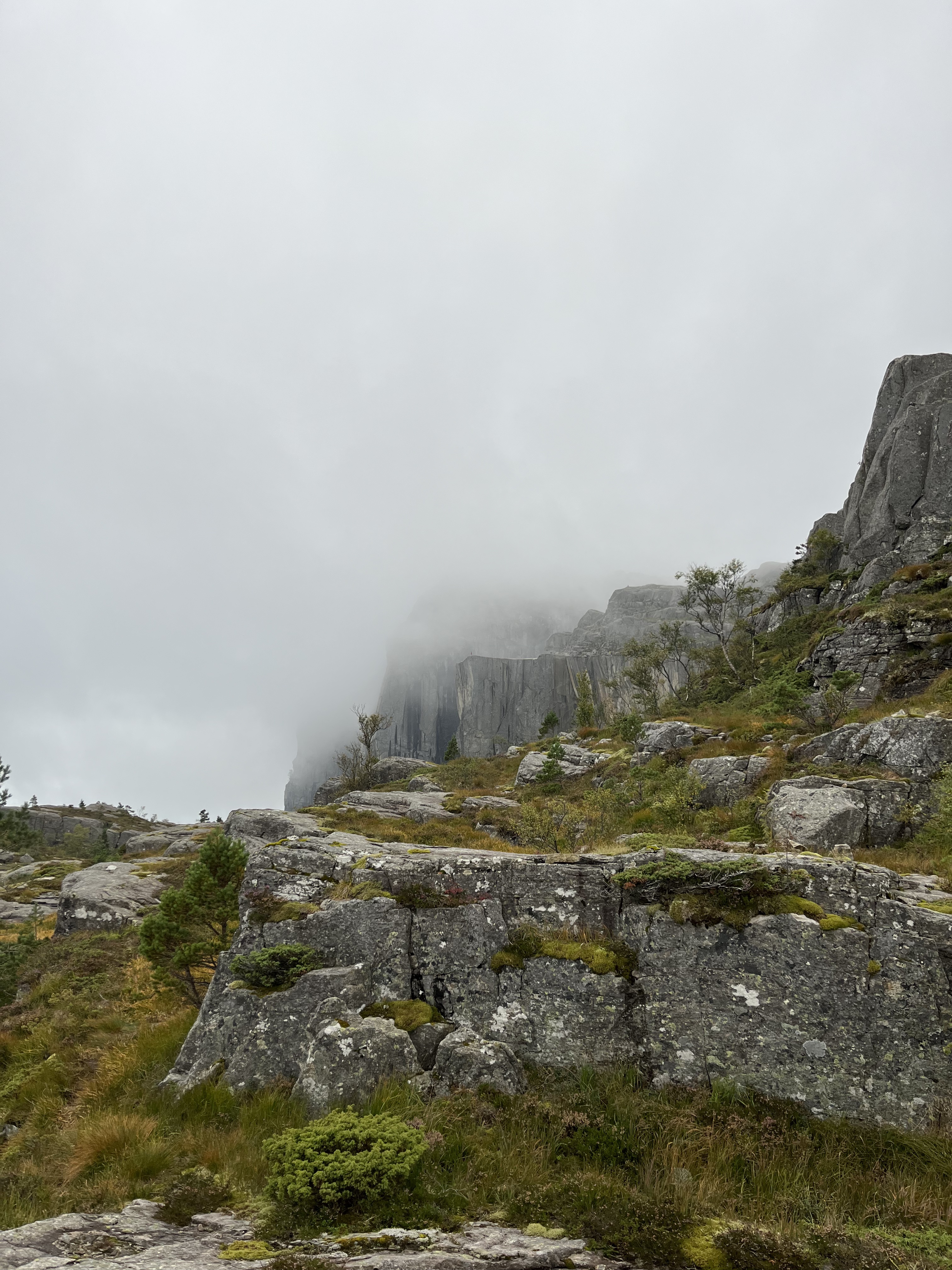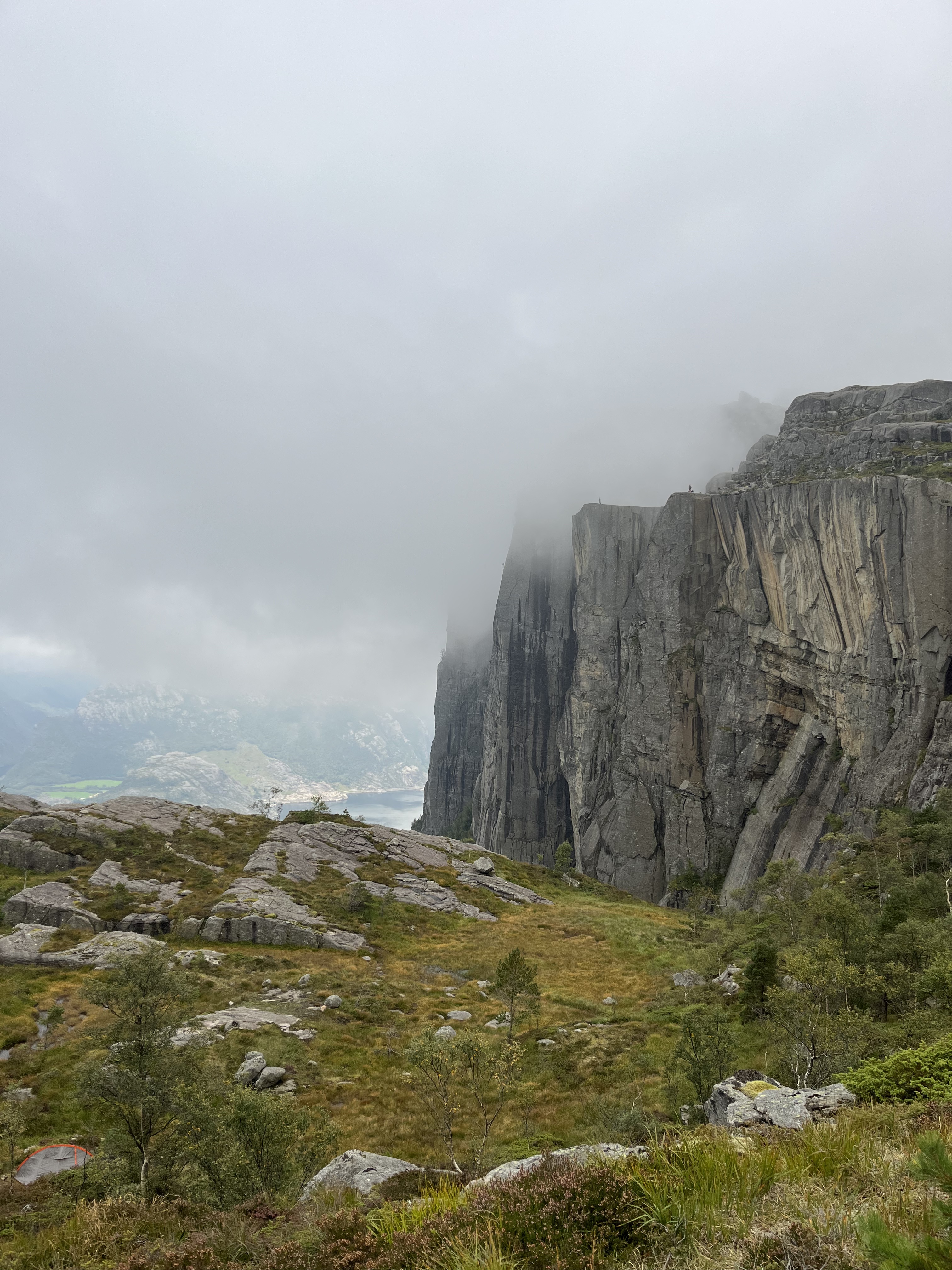 As always a pretty cloudy morning at 6 am. Waking up before the first sun rays as usual. A bit sore, but we earned that. Since our worst enemies were flying all around us again. Yeah we were pretty stinky I get it. Breakfast was postponed again and we headed downwards. Surprising how many people were already on Preikestolen and on their way up. We met some nice people going down, some really loved the idea of camping up there, others were just stunned when we told them.