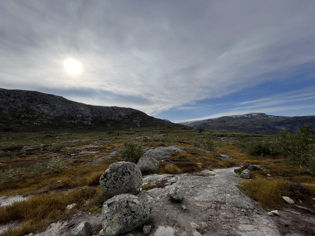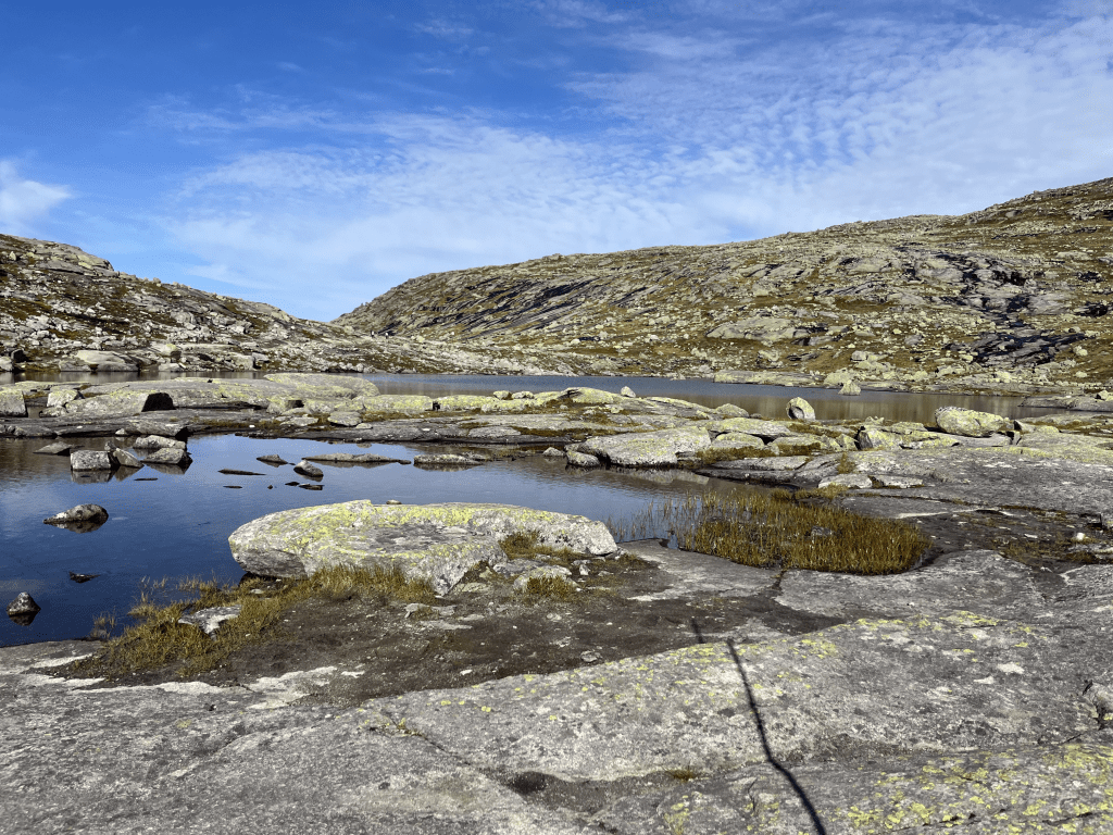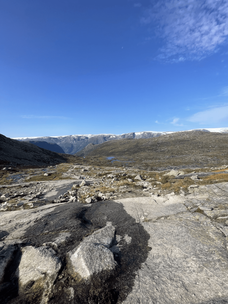 The hike begins pretty steep, in the first 2 and a halb kilometers you climb about 350 meters up. It took us an hour, but from this point on it was way easier. So further 8 km, of enjoying the perfect weather on 1100m altitude. Looking down on Ringedalsvatnet.