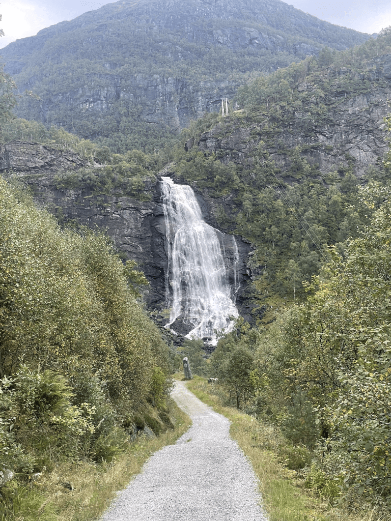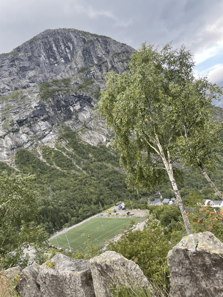 On the way down we drove past a artificial football pitch, I instantly had the urge to play, but my knees were done from descent. After the biggest planned parts, we were really exhausted, we really longed for a shower. Onto another ferry, passed further beautiful lakes, fjords, waterfalls and landscapes. For example the Fossen Bratte or the Samnangerfjorden.