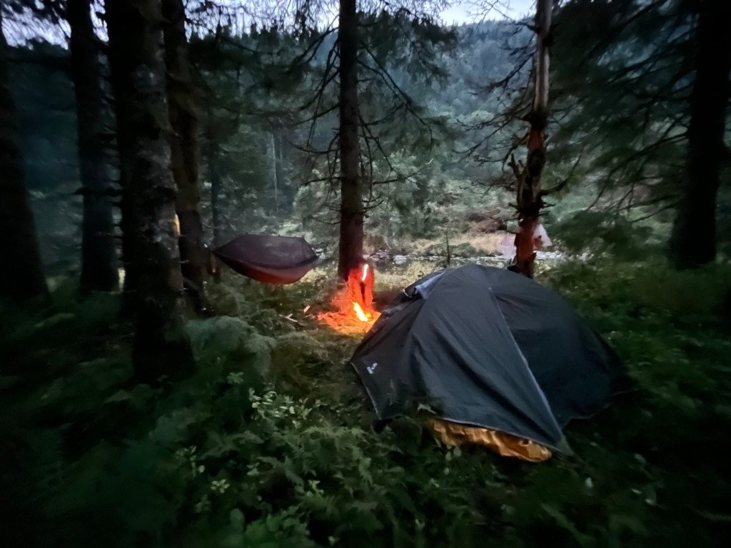 While the water was cooking, I gathered wood for fire, fortunately I could use the cut branches from before. I had a firestarter with me, but I was lazy and took the lighter we bought in the morning. Making a nice fire requires some work. With not enough collected wood, it was a small one just to celebrate our first day. It ended with a smooth whiskey under the light of the stars before getting in the tent.