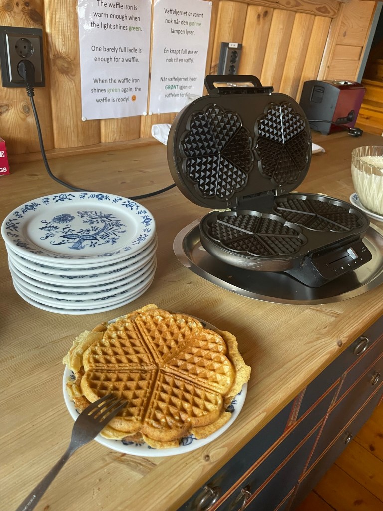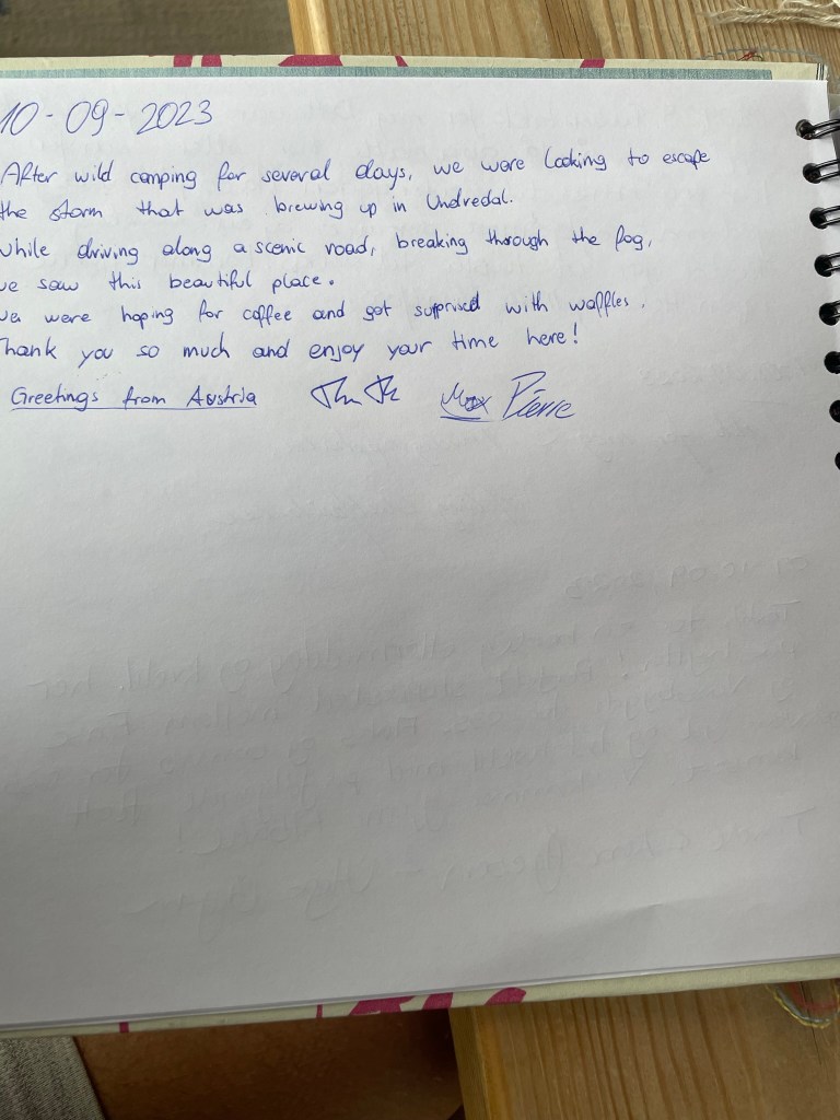 You will not believe it. Striving for a little café or some little hut where we could have cup of tea or coffee, have little snack and being honest, having a brutal shit. We found heaven, and it’s name was, yeah you guessed it, Steinbergdalshytta. Shoes off, breakfast only till 10am, it’s 11am, f*ck. To our disbelief the boss came and brought us waffles with jam and cream, also coffee/tea. She was everything we needed right now. Heaven on earth. We had to leave a note in the guestbook.